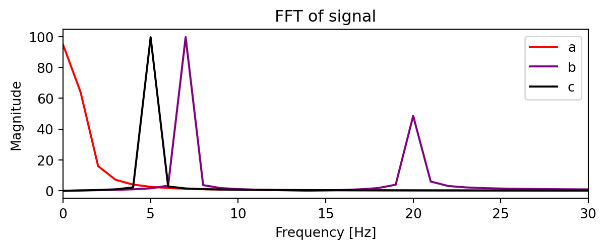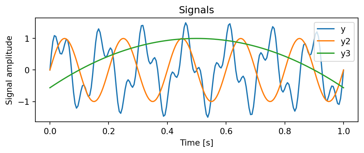 - The DFT of signal \(y\) is \(b\), the DFT of signal \(y2\) is \(c\), and the DFT of signal \(y3\) is \(a\). We can tell because \(y2\) is a simple sin curve, so its DFT is a single peak. \(y\) appears to be a sum of two sin curves, so its DFT has two peaks. \(y3\) has many frequency components, but they are low frequency, so the DFT has a peak near 0.