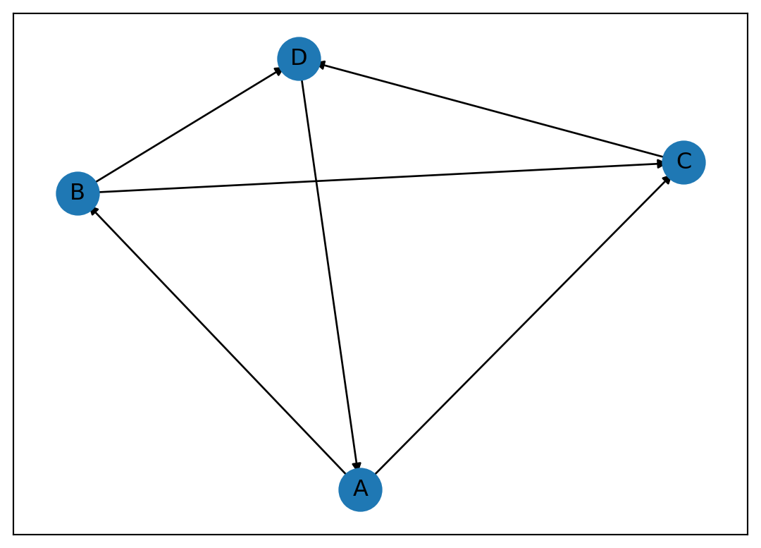 A directed graph has vertices labeled \(A\), \(B\), \(C\), and \(D\). The edges are given by the following incidence matrix B: