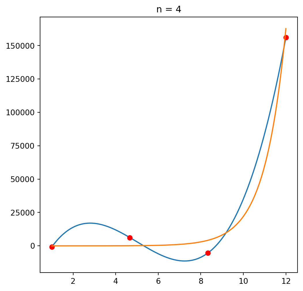 We’ll start with picking 4 interpolating points: \vec x = \mathtt{\text{[ 1. 4.66666667 8.33333333 12. ]}}. Then we have our matrix A: