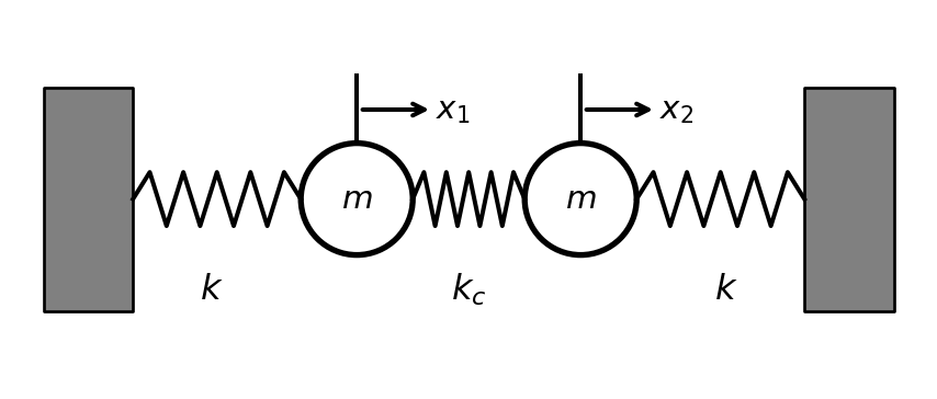 Two identical masses \(m\) connected by springs: wall—\(k\)—mass 1—\(k_c\)—mass 2—\(k\)—wall. Let \(x_1\), \(x_2\) be displacements from equilibrium.