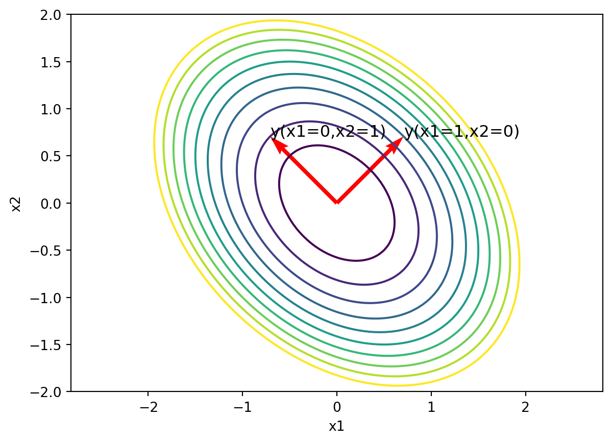 Each coordinate \(y_i\) is the projection of the positions \(\mathbf{x}\) onto the eigenvector \(\mathbf{v}_i\). . . .