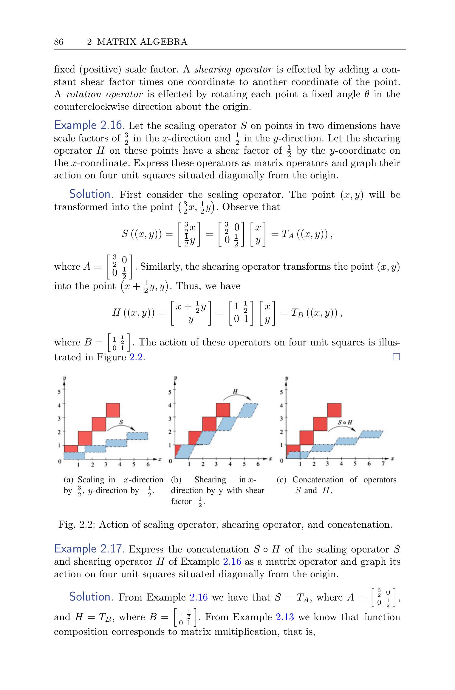 The concatenation S \circ H of the scaling operator S and shearing operator H is the action of scaling followed by shearing.