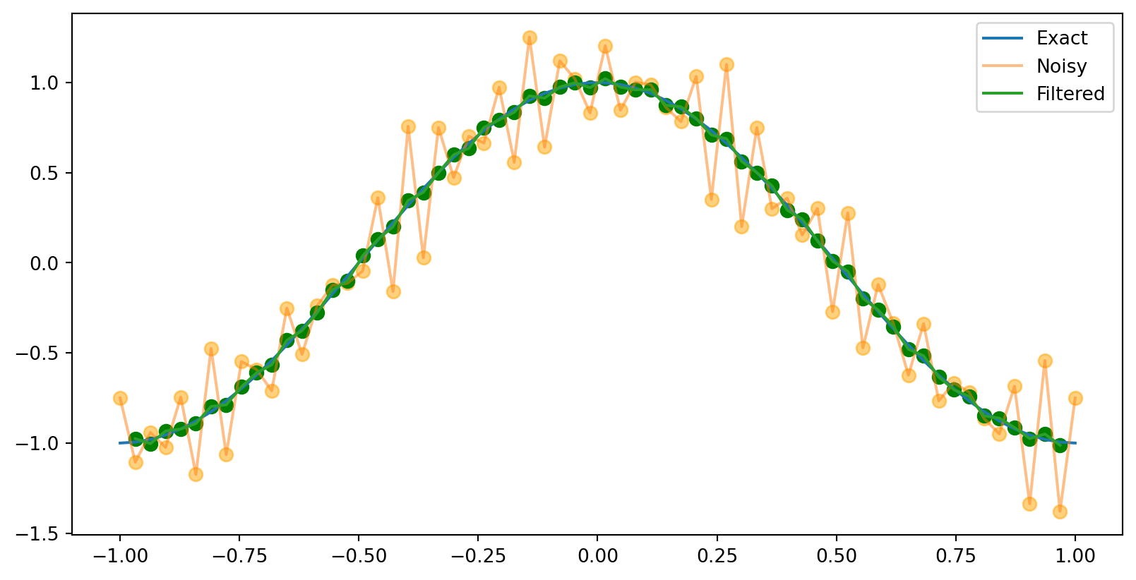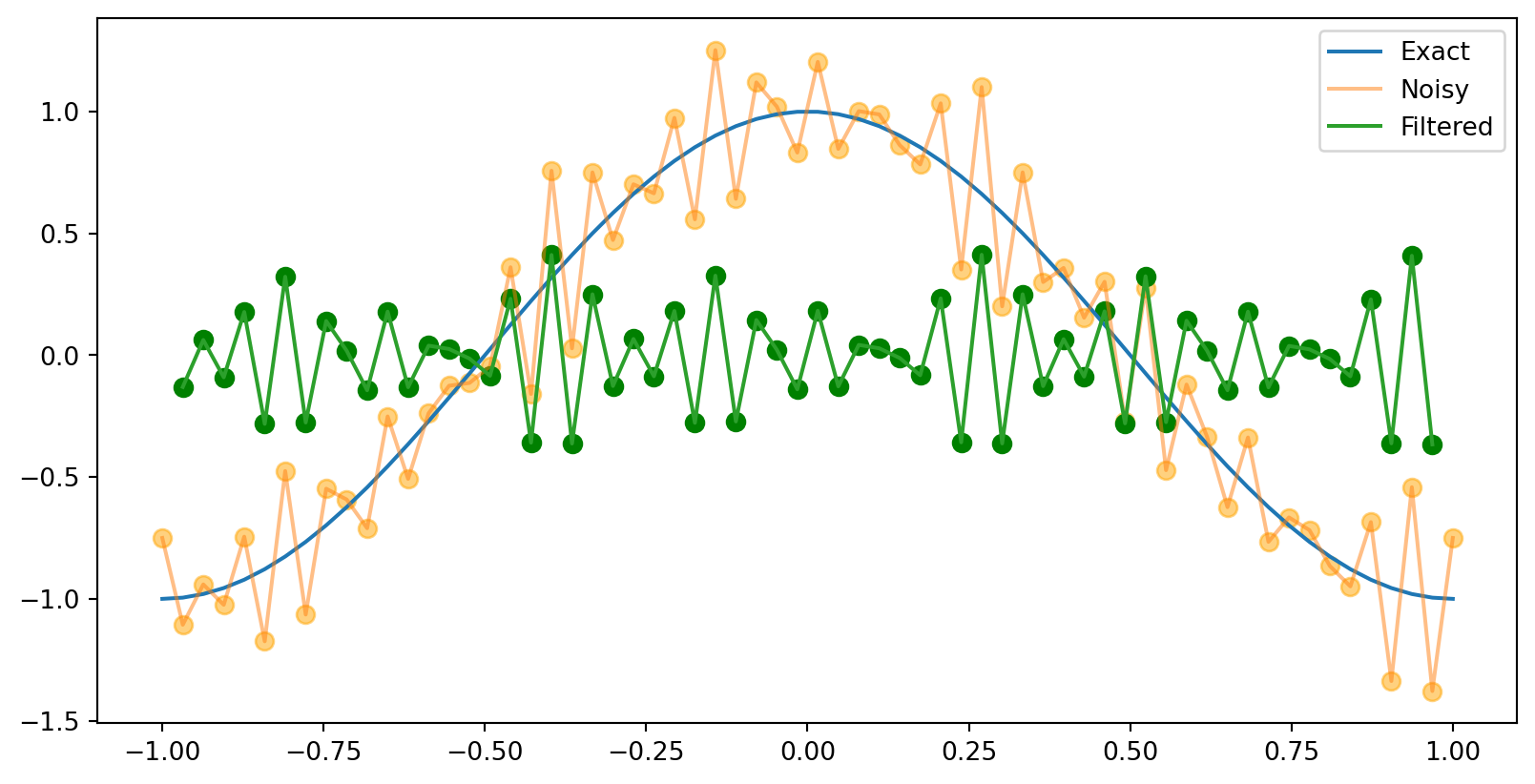 This captured the low-frequency part of the signal, and filtered out the high-frequency noise. That’s just what we wanted! This is called a low-pass filter.