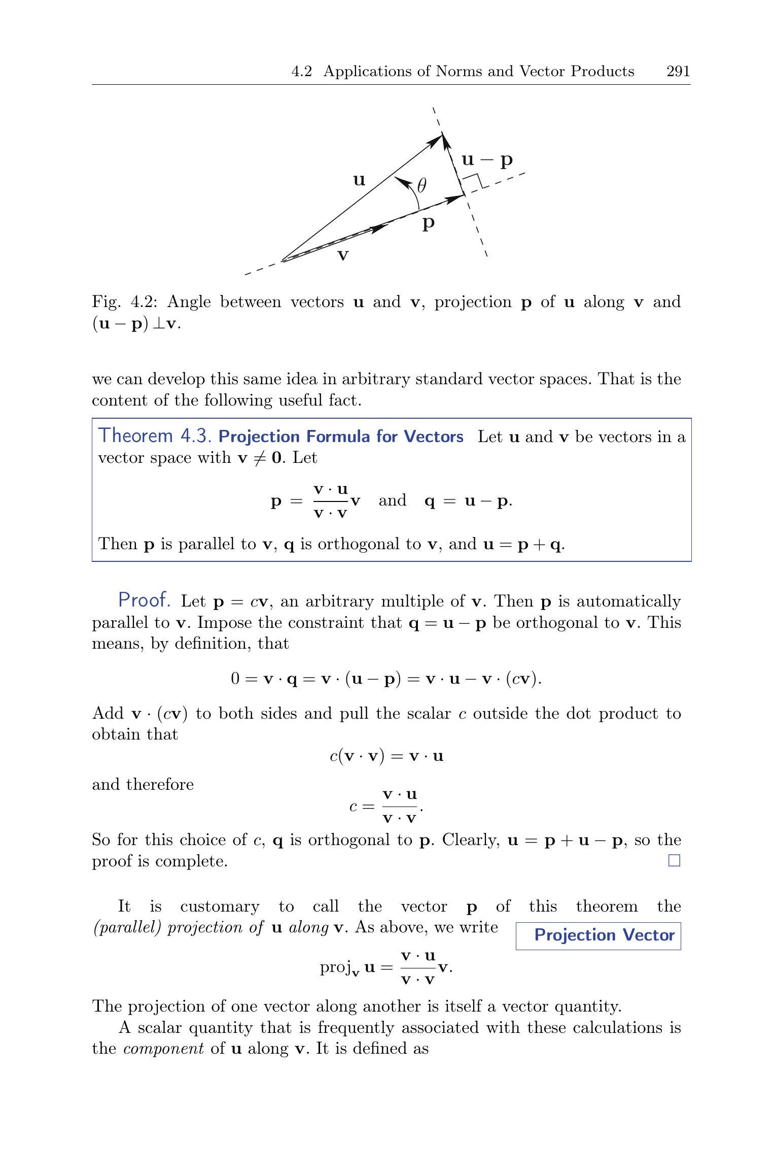 Then \mathbf{p} is parallel to \mathbf{v}, \mathbf{q} is orthogonal to \mathbf{v}, and \mathbf{u}=\mathbf{p}+\mathbf{q}.