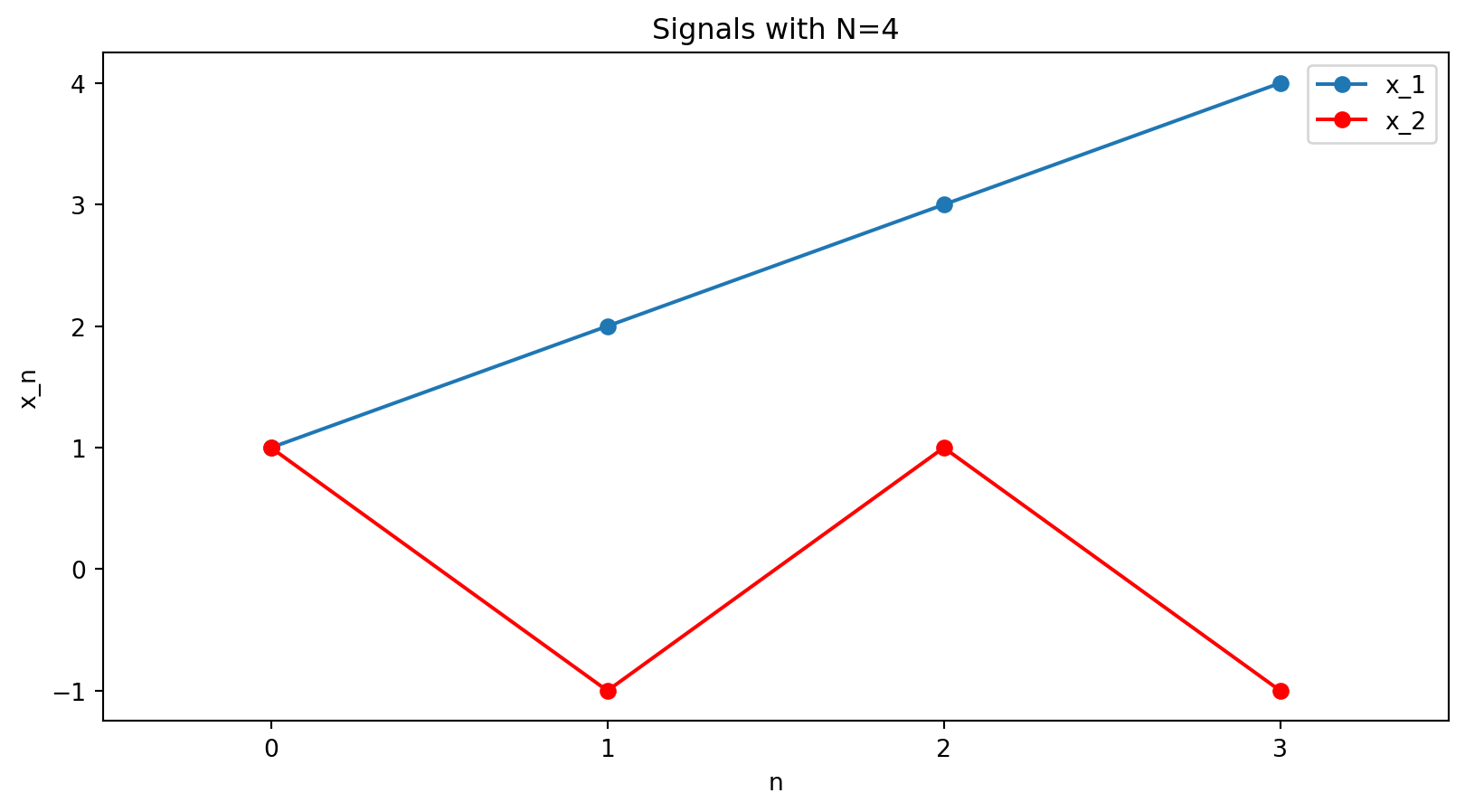 Examples: for N=4, x_1 = [1,2,3,4], \quad x_2 = [1,-1,1,-1].