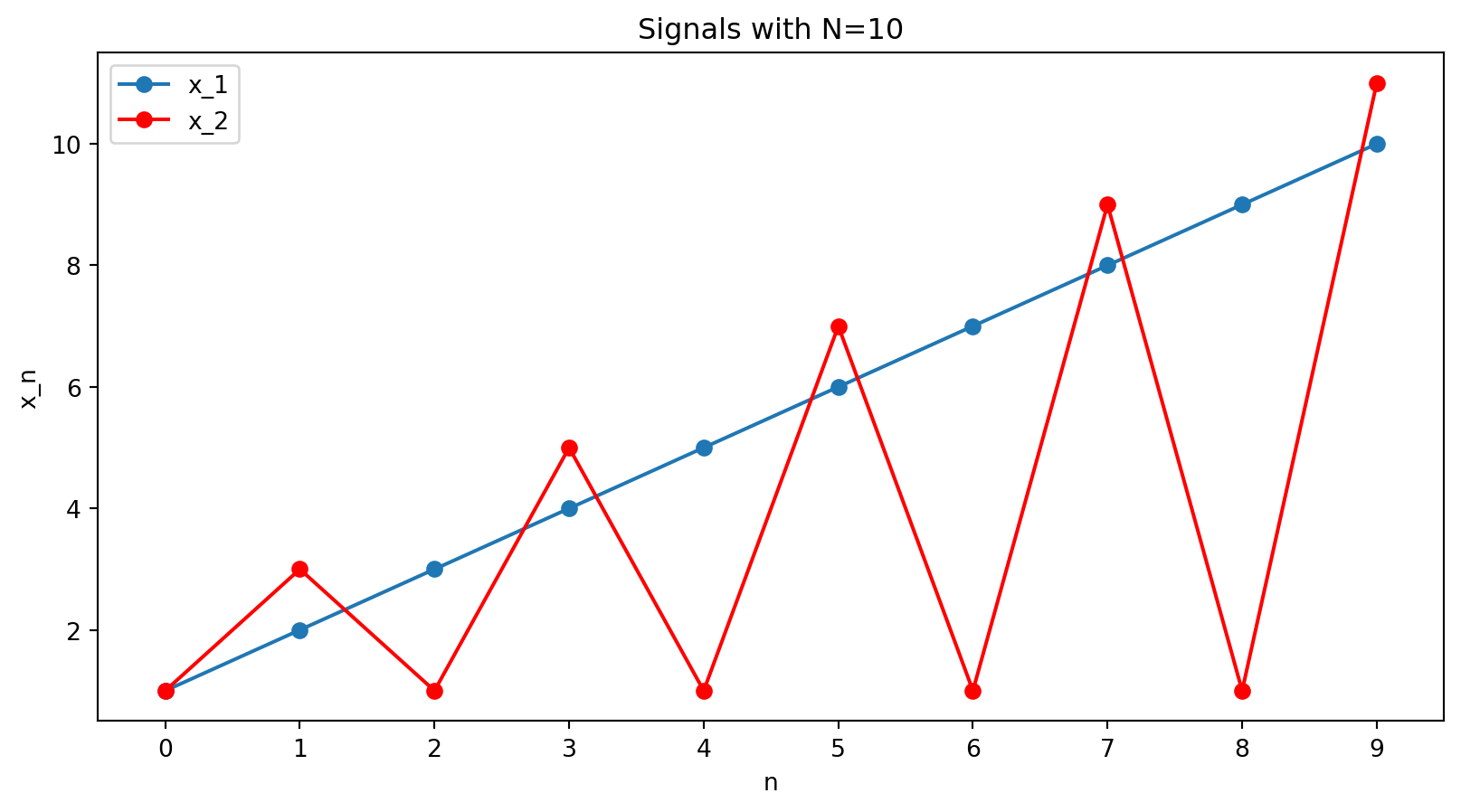 Or for N=10, x = [1,2,3,4,5,6,7,8,9,10], \quad x = [1,3,1,5,1,7,1,9,1,11].