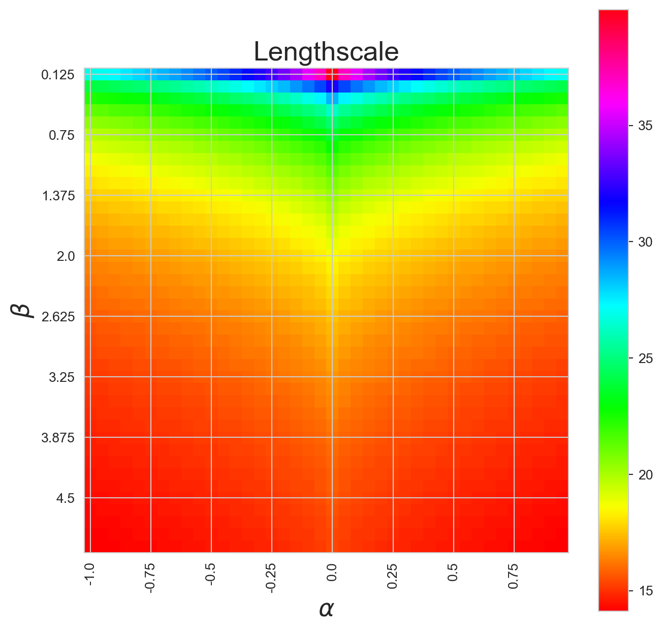 Let’s use it to see how the length scale of the system changes as a function of \(\alpha\) and \(\beta\):